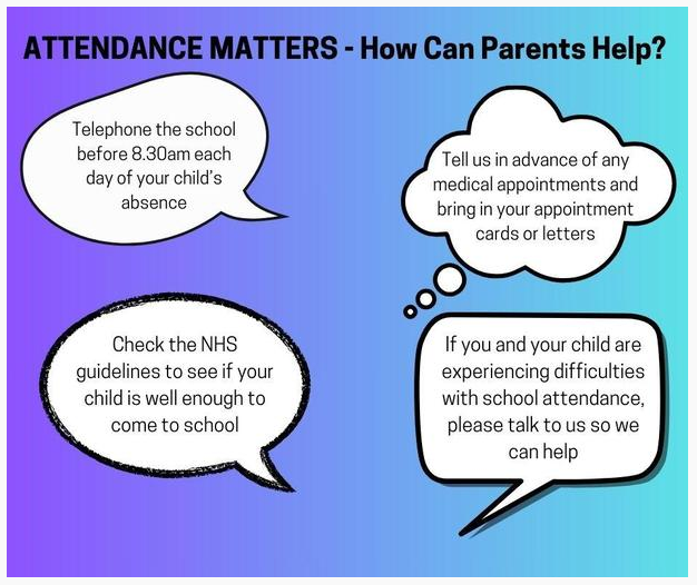 If there are concerns about your child's lateness or attendance, the class teacher or administrative team will contact you. Please be open about the challenges you are facing, in order for the school to try their best to support you and your child to improve their attendance.